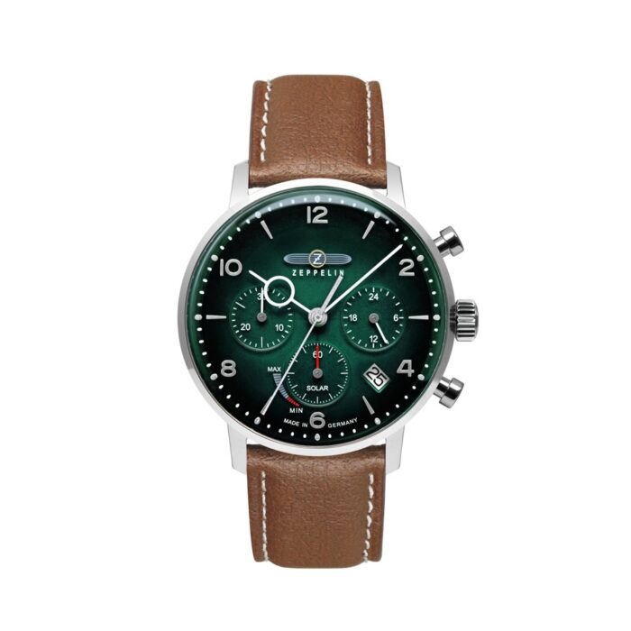 Καινούργιο ρολόι χειρός ανδρικό LZ 129 Hindeburg Chronograph Green της εταιρίας Zeppelin. Με πράσινο καντράν, ασημί στοιχεία και λευκούς δείκτες.